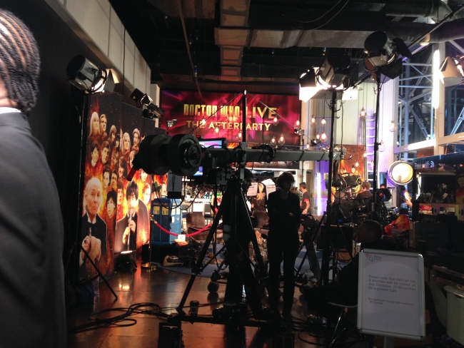 Sábado nós chegamos no BFI lá pelas 17h para coletar os ingressos na bilheteria, e depois íamos comer e talvez ficar esperando por ali mesmo. Quando chegamos já vimos um set de Doctor Who montado – o que descobrimos depois ser o cenário da Afterparty que a BBC transmitiu logo depois do episódio. Até aí tudo bem, nada demais. Eu tirei foto e quando o segurança viu ele me pediu para parar – era pra ser “surpresa”.