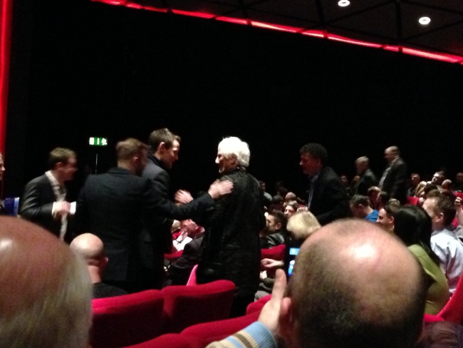 E aí uma porta lateral abriu e o Matt Smith entrou! Todo mundo começou a gritar e a aplaudir, foi muito legal!! Ele sorriu, acenou, e foi sentar no lugar dele, bem na ponta do bloco central de poltronas. Algumas pessoas foram falar com ele, umas claramente o conheciam, outras podiam ser fãs, não sei. Ele foi super simpático! Pouco tempo depois o John Hurt entrou, ele passou bem rapidinho pro lugar dele, na fileira da frente do Matt, eu acho. Todo mundo aplaudiu e gritou de novo, ele deu um sorriso meio tímido e foi sentar (nem consegui tirar foto dele chegando). Dois produtores da BBC tomaram a palavra e começaram a falar. (Não sei quem são, mas tirei fotos) Um deles disse que não podia agradecer todo mundo porque ia acabar esquecendo alguém, então ele agradeceu ao pessoal que trabalha e à BBC, e agradeceu aos fãs. Óbvio que a plateia adorou!