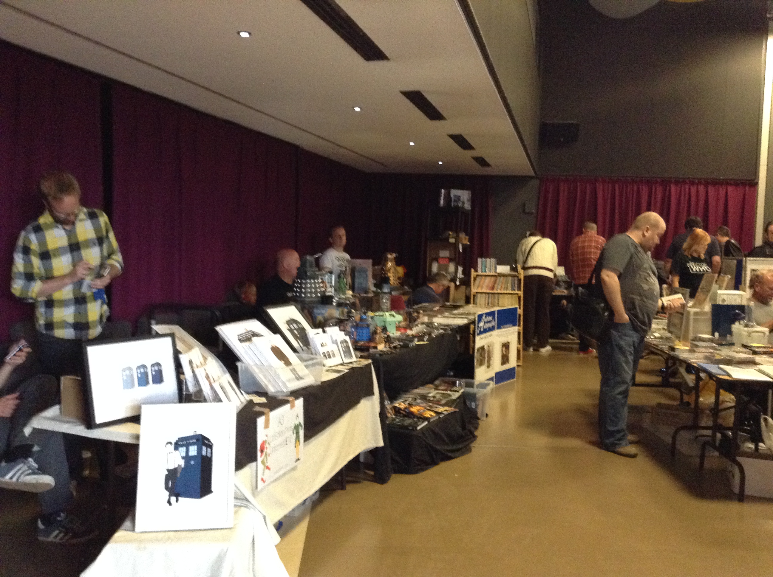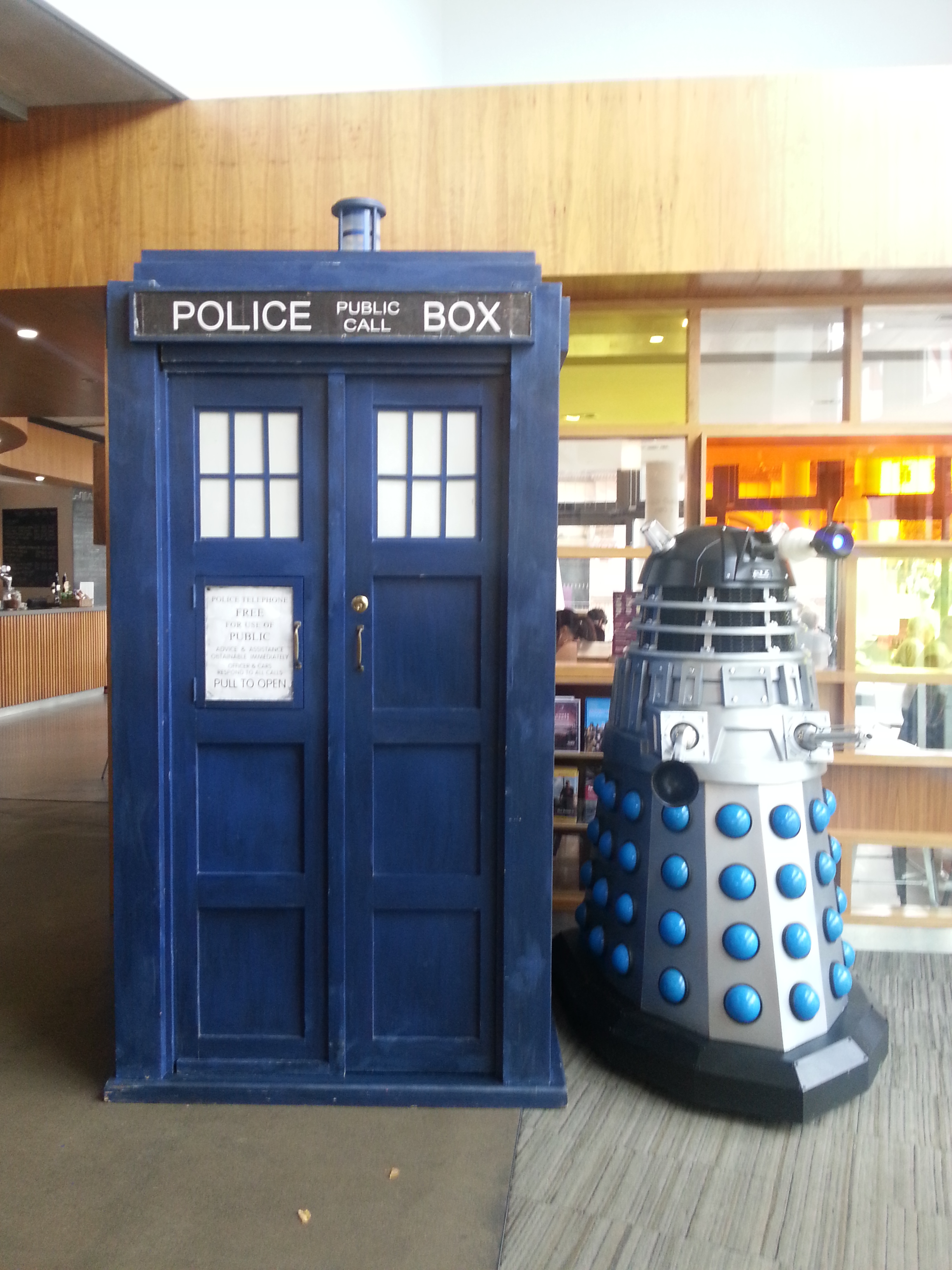 No sábado, eu estava super ansiosa para o evento (primeira convenção de Doctor Who e com o seu Doutor preferido) que só consegui me acalmar quando cheguei no QUAD, um moderno centro cultural mantido pela prefeitura de Derby. Tinham vários cosplayers, vários vestidos de Fivey (como chamamos o Quinto Doutor aqui), outros do Quarto e Décimo – estava no lugar certo. E logo montaram uma TARDIS e o Dalek na entrada… perfeito!