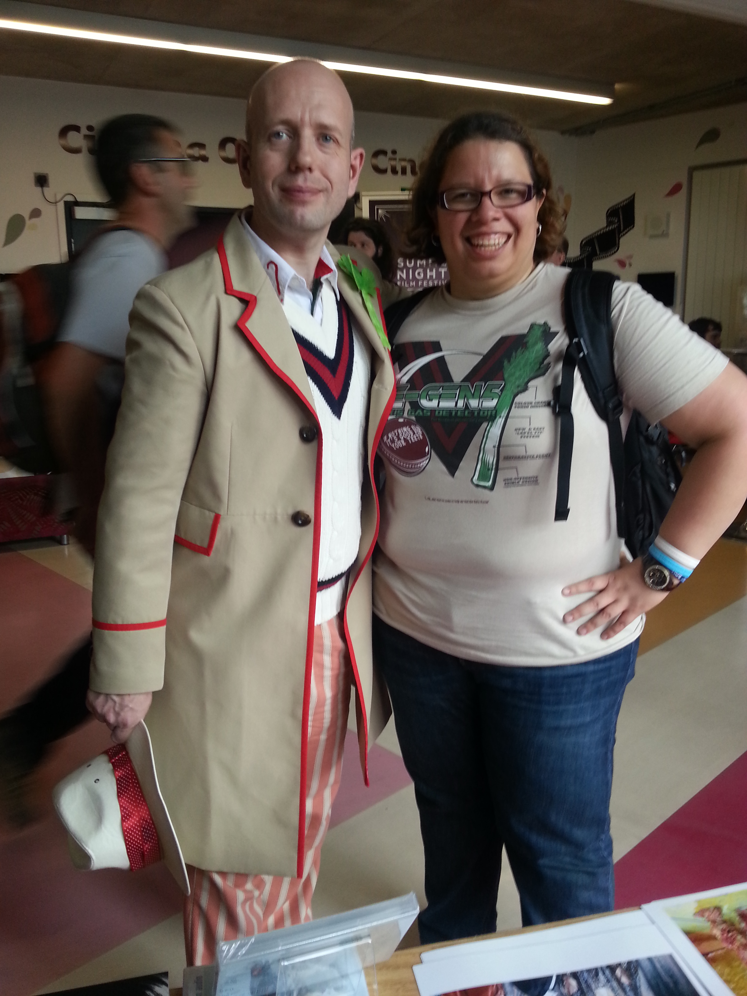 Na hora do autógrafo, tive que soletrar meu nome (os britânicos sentem dificuldade de entender) e fiz uma versão usando o nome dos primeiros companions dele (com o T de Tegan, A de Adric, N de Nyssa e I de Infinity – do Arc of Infinity) e deu certo… e o Peter me perguntou se Tatiana é um nome do Leste Europeu, e eu disse que é de origem russa. Agradeci pela atenção e me despedi dele, com um sorrisão estampado na cara – tinha conhecido o meu Doutor! Mas essa não seria a última vez que eu o viria ao longo do dia.