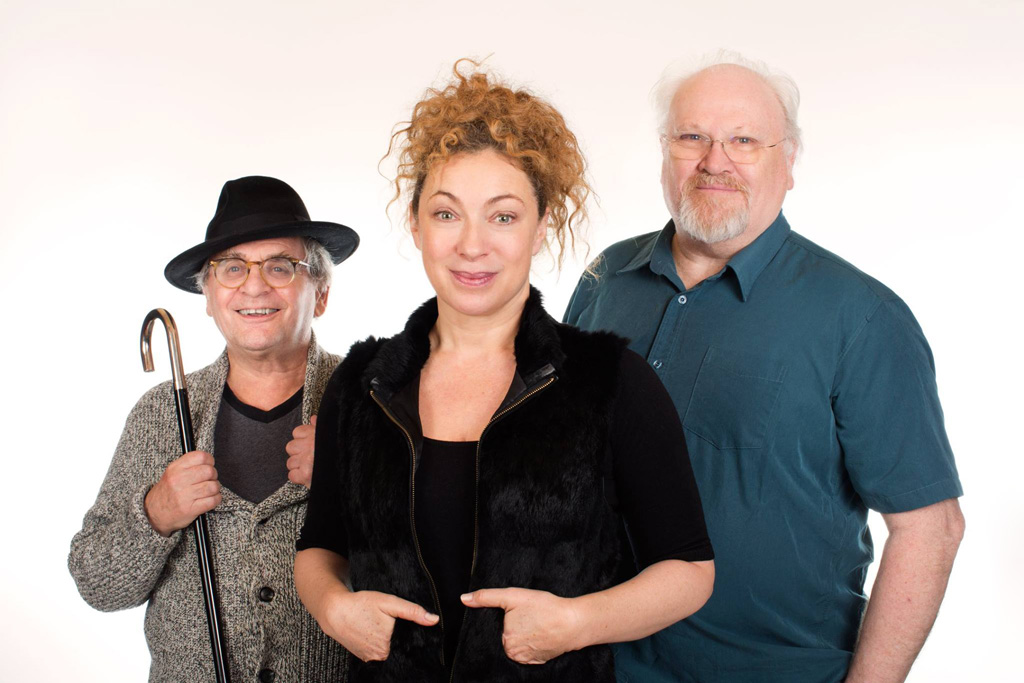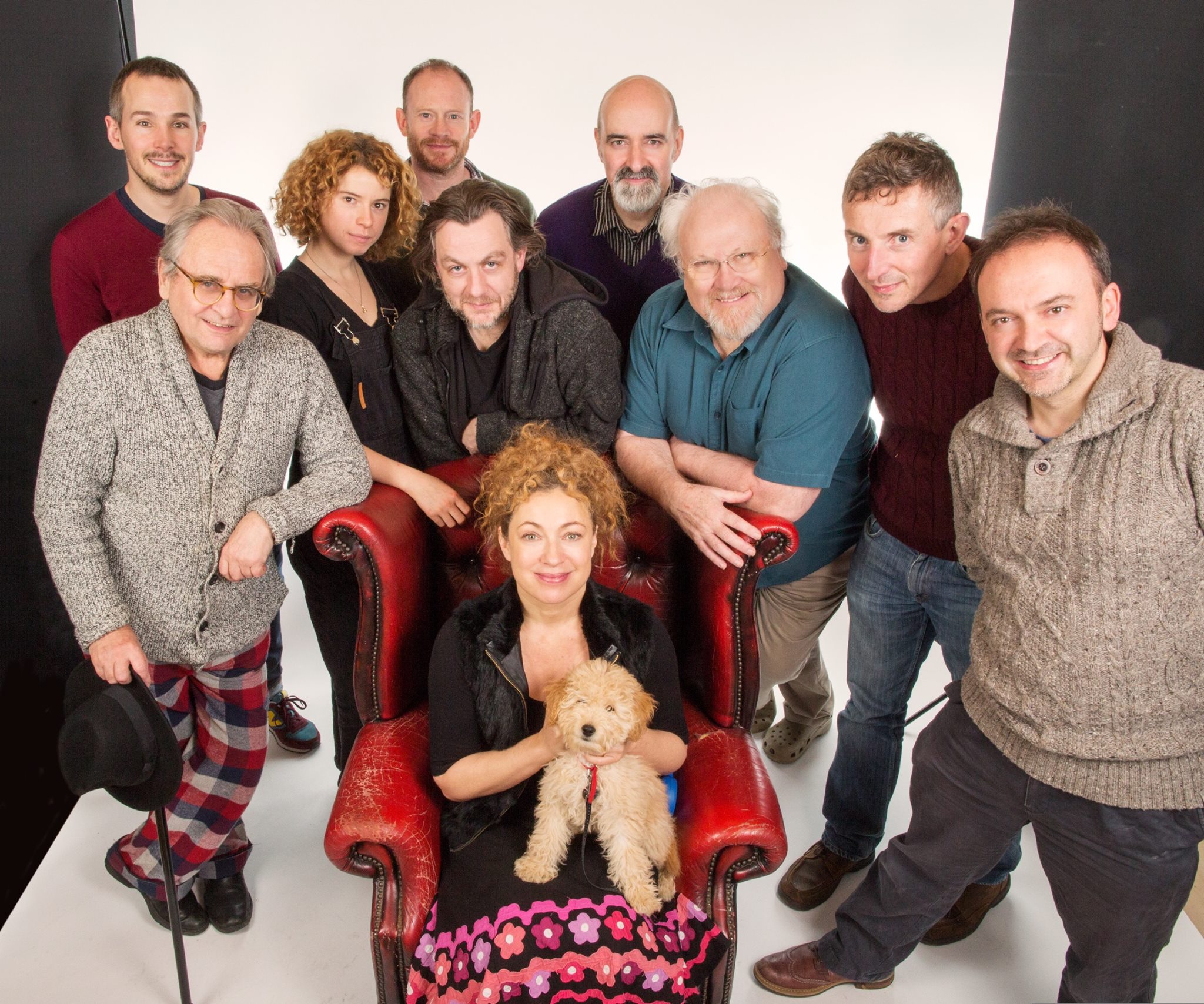 Equipe de Diary of River Song: Paul Keating, Jessie Buckley, Robert Hands, Nicholas Briggs, Sylvester McCoy, Alan Cox, Colin Baker, David Richardson, Matt Fitton e Alex Kingston com Elliot, o mascote da Big Finish, no colo.